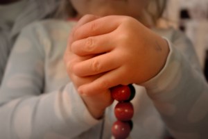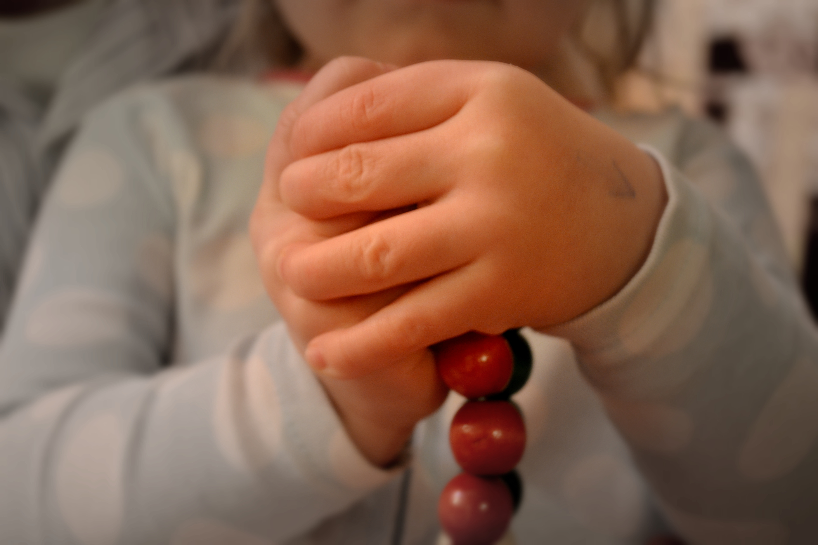 We started slowly. In the beginning, Andy or I would take her hand and make the sign of the cross before and after prayer, and she quickly learned to hold her hands together. She (usually) sits quietly and bows her little head.