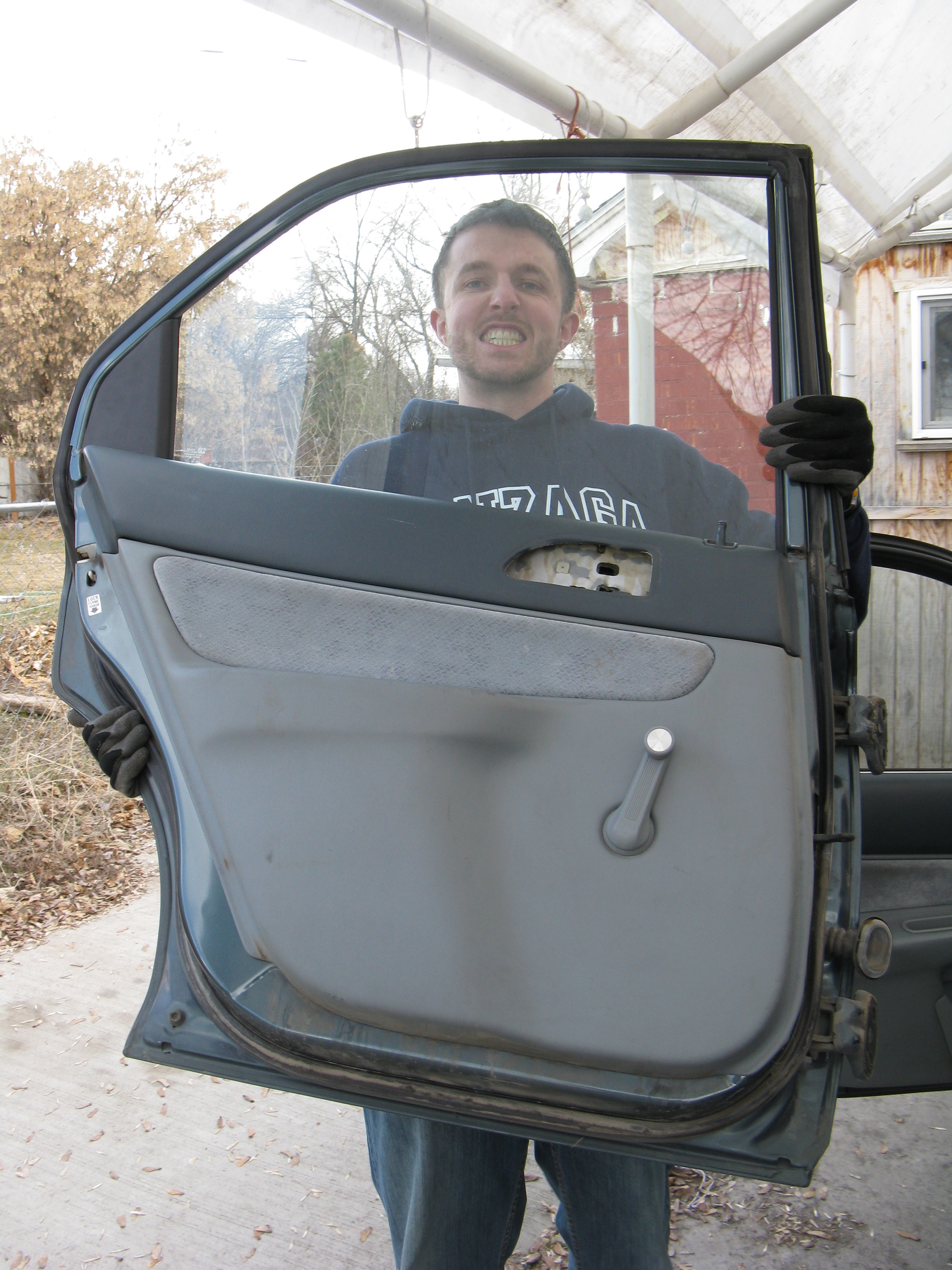So, a long time ago, someone (who will remain unnamed) backed into the rear driver side door of the green Honda Accord my mom drove, rendering it useless. It remained that way for many a year, and (after inheriting the car for college) it became part of my ride-giving ritual to tell people “Oh, that door doesn’t work. You’ll have to go around.” Friends got used to it, and we all lived happily with 3 doors for a long time. Until Mo made an appearance. We decided 4 doors would be the best option, what with a baby and all. So Julie and Bob helped us snag a new-to-us shiny (silver) door from a junk yard. Andy and Bob performed the successful operation. And I am happy to say that the door works great. Now, however, we are those people. You know, the ones with a door that’s a different color than the rest of the car. Yeah…we’re cool. We know it.
