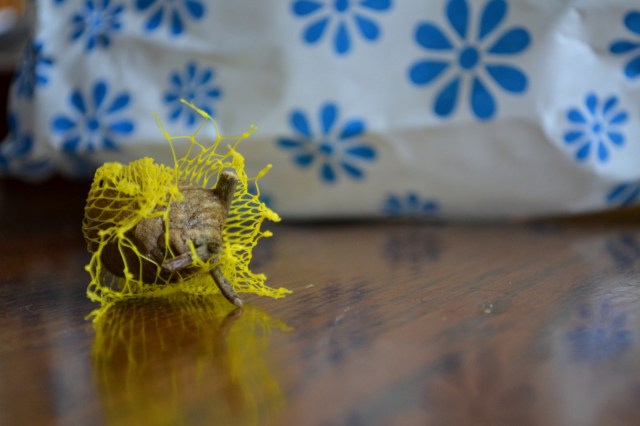 Find the only paper bag you have in the house, which happens to be from your husband’s recent dental visit. Hope that flouride residue doesn’t affect the “baby bees.” Put said egg sac into the paper bag and close with a clothes pin, paper clip, stick of chewing gum…you get the picture.