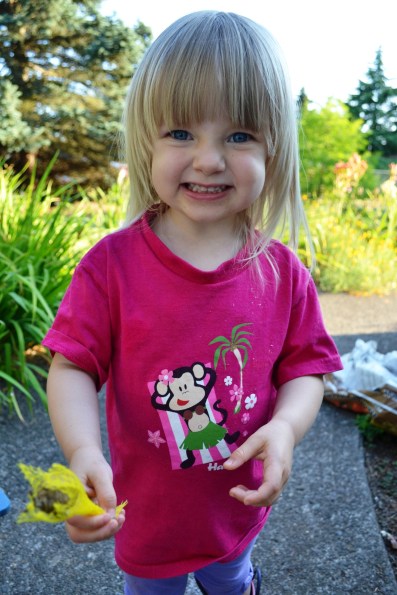 Give the egg sac to a super cute 2 year old. Tell her to be gentle and not to squish anything. Observe her giant smile and enthusiastic “Baby bees!”.