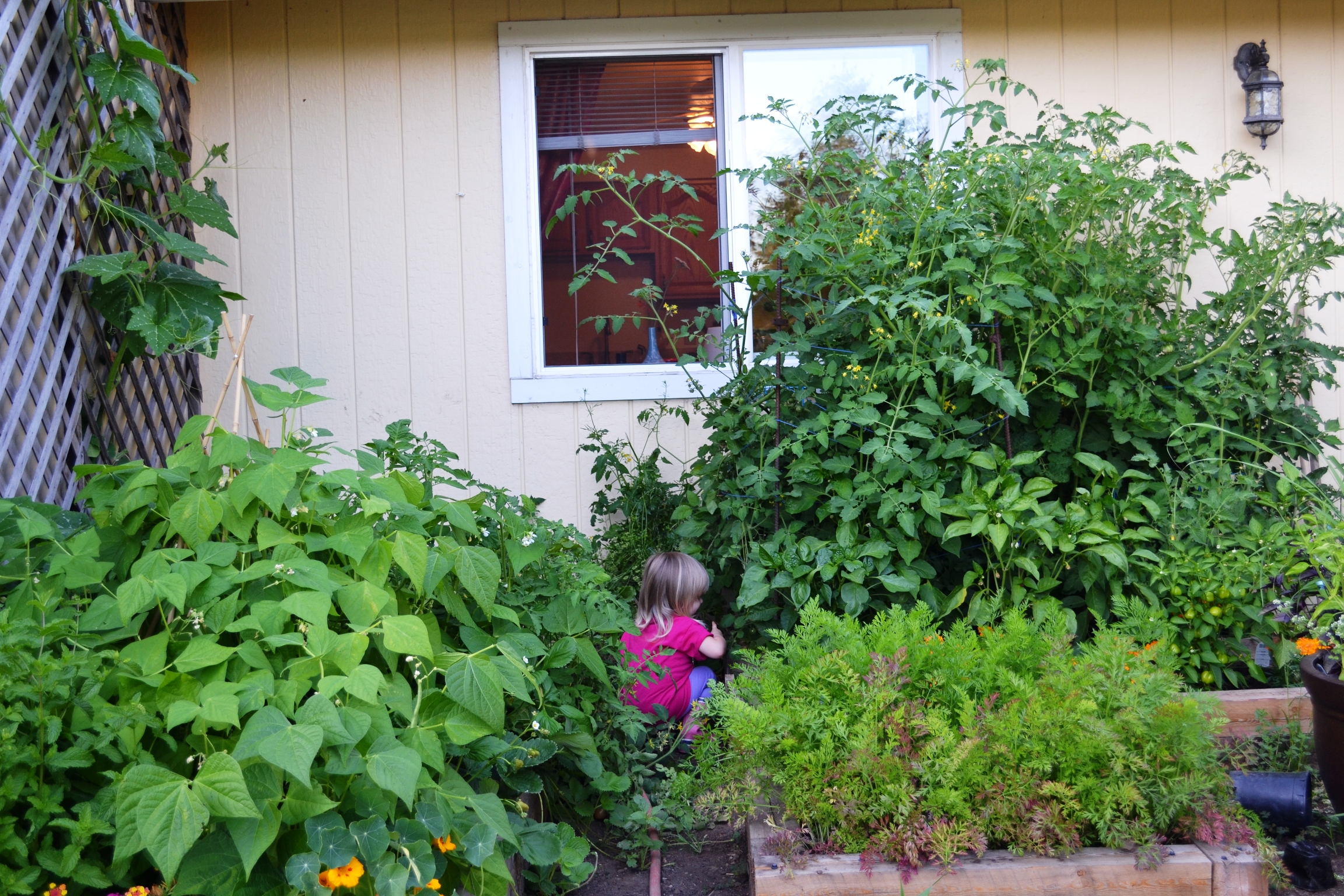Distract your two year old by telling her there are ripe cherry tomatoes.