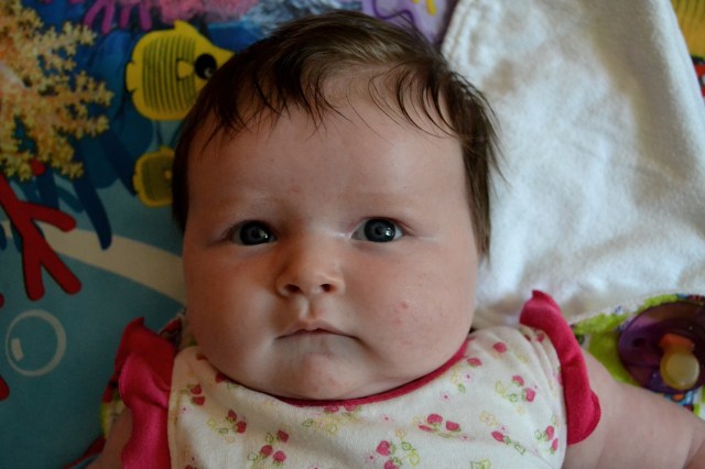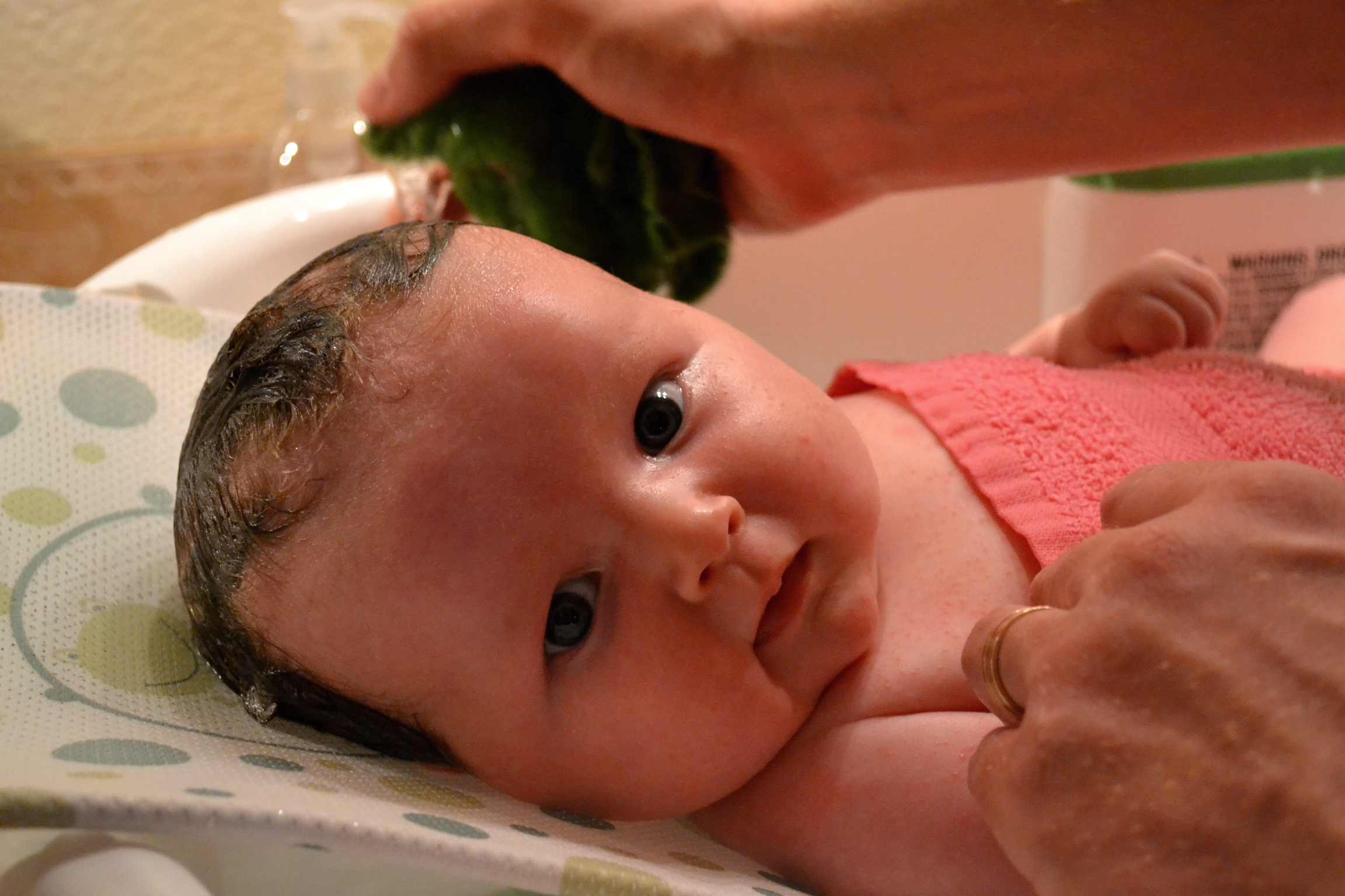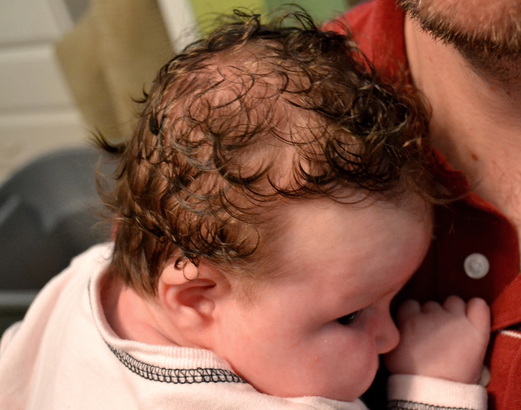 Lu also gets a lot of “Wow! That’s quite a bit of hair!” and “When do you think that hair will fall out?” I don’t think it’s going to. Mo’s grew out platinum blonde and I’m starting to think Lu’s will do the same. Lucy’s is definitely darker than Mo’s was, has red undertones, and is super curly when wet! I love that.