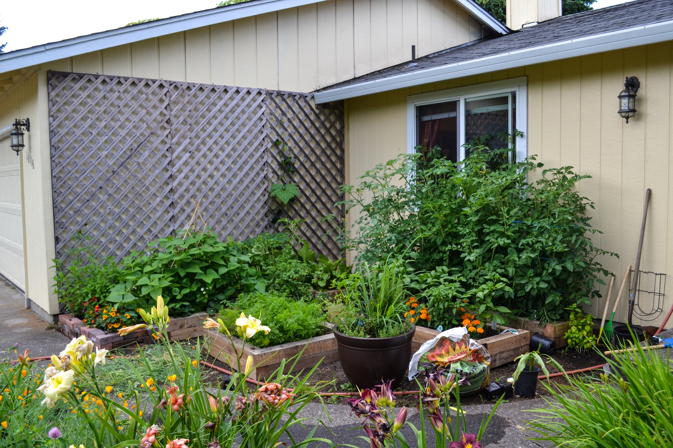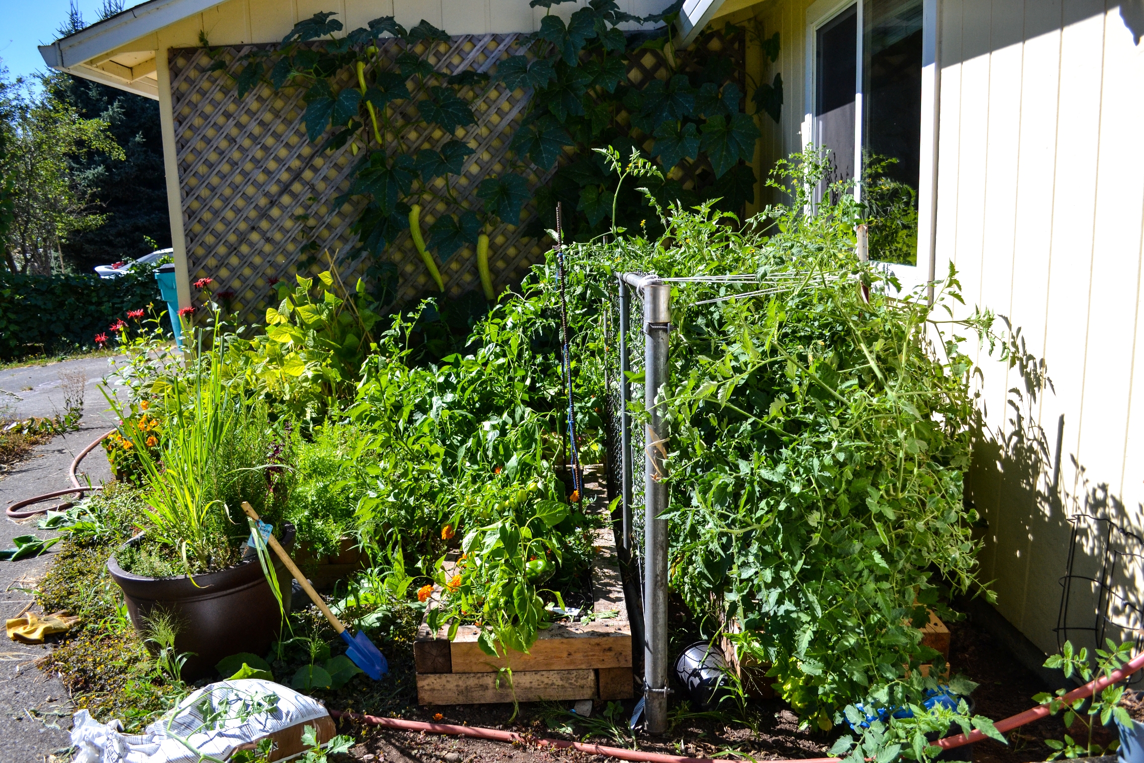 Not the most aesthetically pleasing fix, and I am a little worried that the metal will heat up and burn some tomato leaves. But not that worried. Have you seen those monsters? I’m pretty sure they’ll survive without some green.