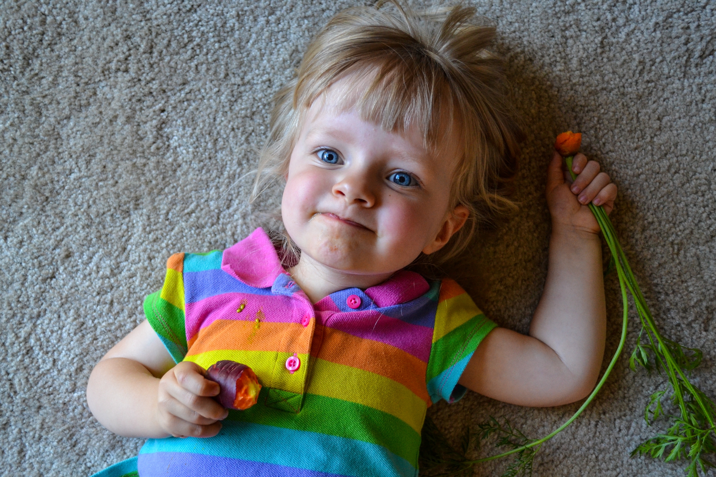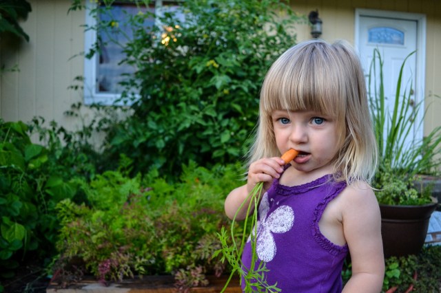 As far as she knows, cherry tomatoes are orange and carrots can be purple. She asks for a purple carrot every time we walk by. She picks mint and parsley leaves to chew. We are raising such a hippie child.
