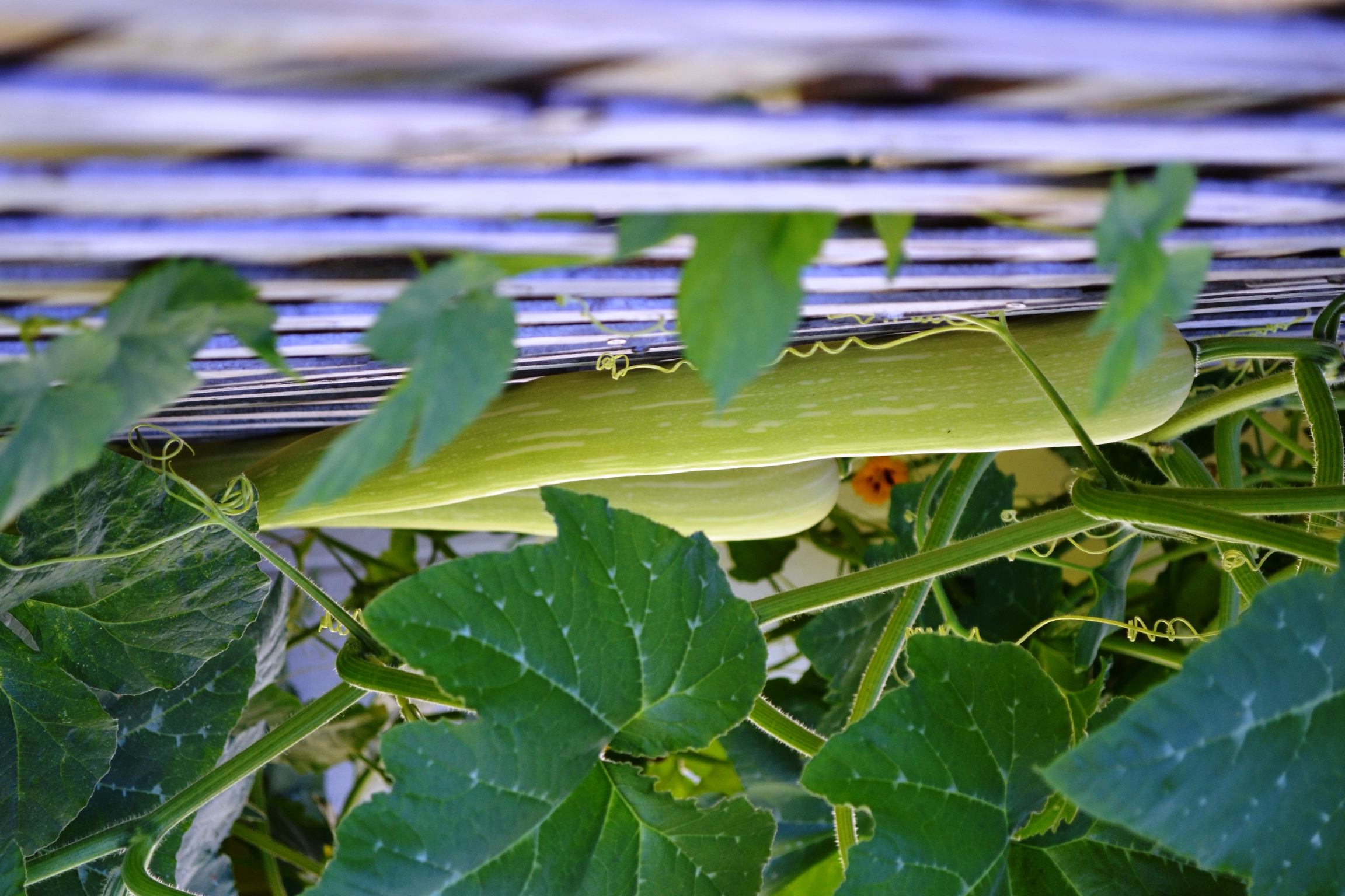 Uh Oh. It’s kind of, sort of pulling the trellis off the wall…and may or may not have found the roof…Oops. Oh well. I hope the squash taste good. I’m not even sure which variety this one this is…