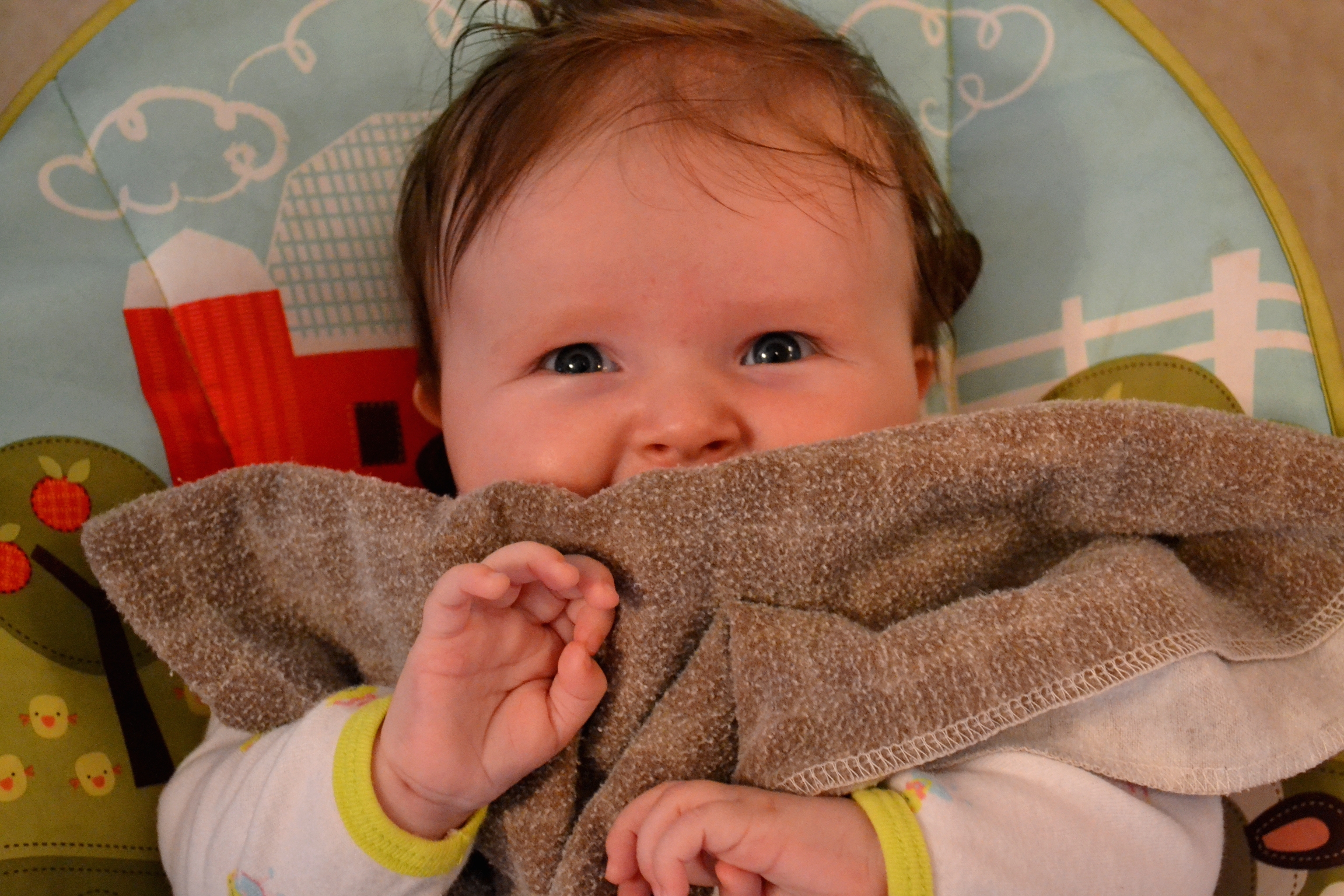 You spend a lot of time on the play mat and are fascinated by the plastic rings that hang there. The kitten loves to sleep right next to you. When in the bouncy chair, you eagerly watch your sister run from place to place, and demand eye contact while we’re eating around the table.