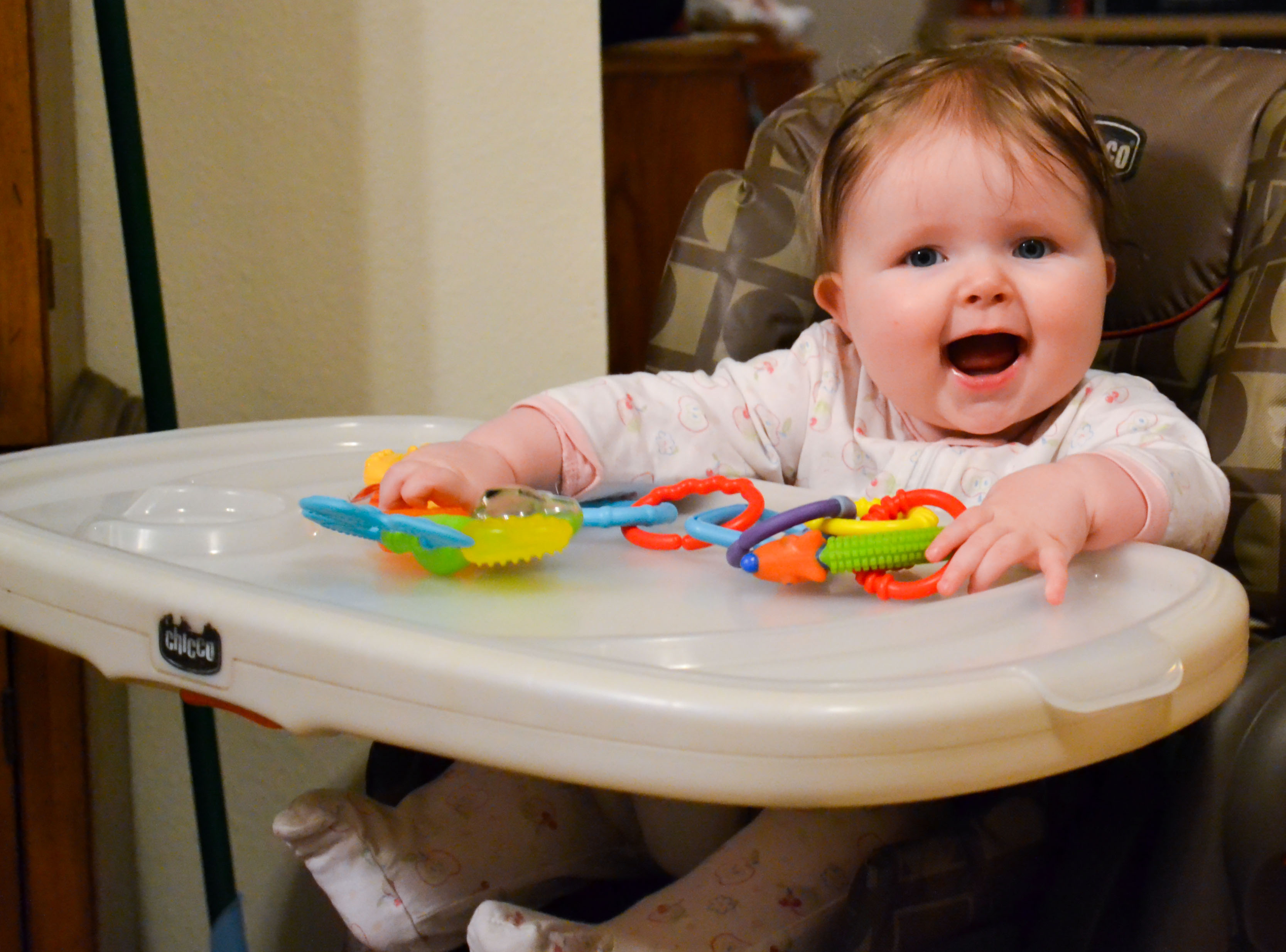 For those of you who like numbers, here are the stats from her well-check today: Height- 2’3″, Weight- 18lbs 4oz, Head Circumference- 18.27″