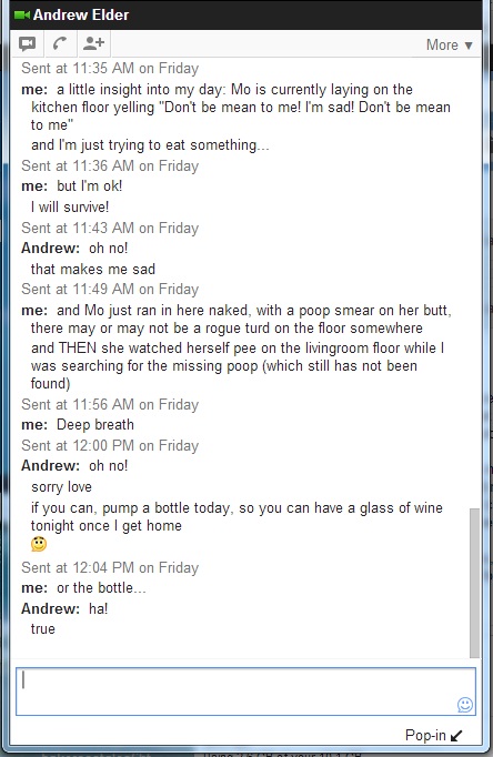 Mo, I love you. You will understand the need to vent about baby bodily fluids some day. And how a glass of wine (or three) can sometimes make a hard day better… Probably once you have kids. Until then, know that I love you. Even when I am “mean to you”. -Your Mommy