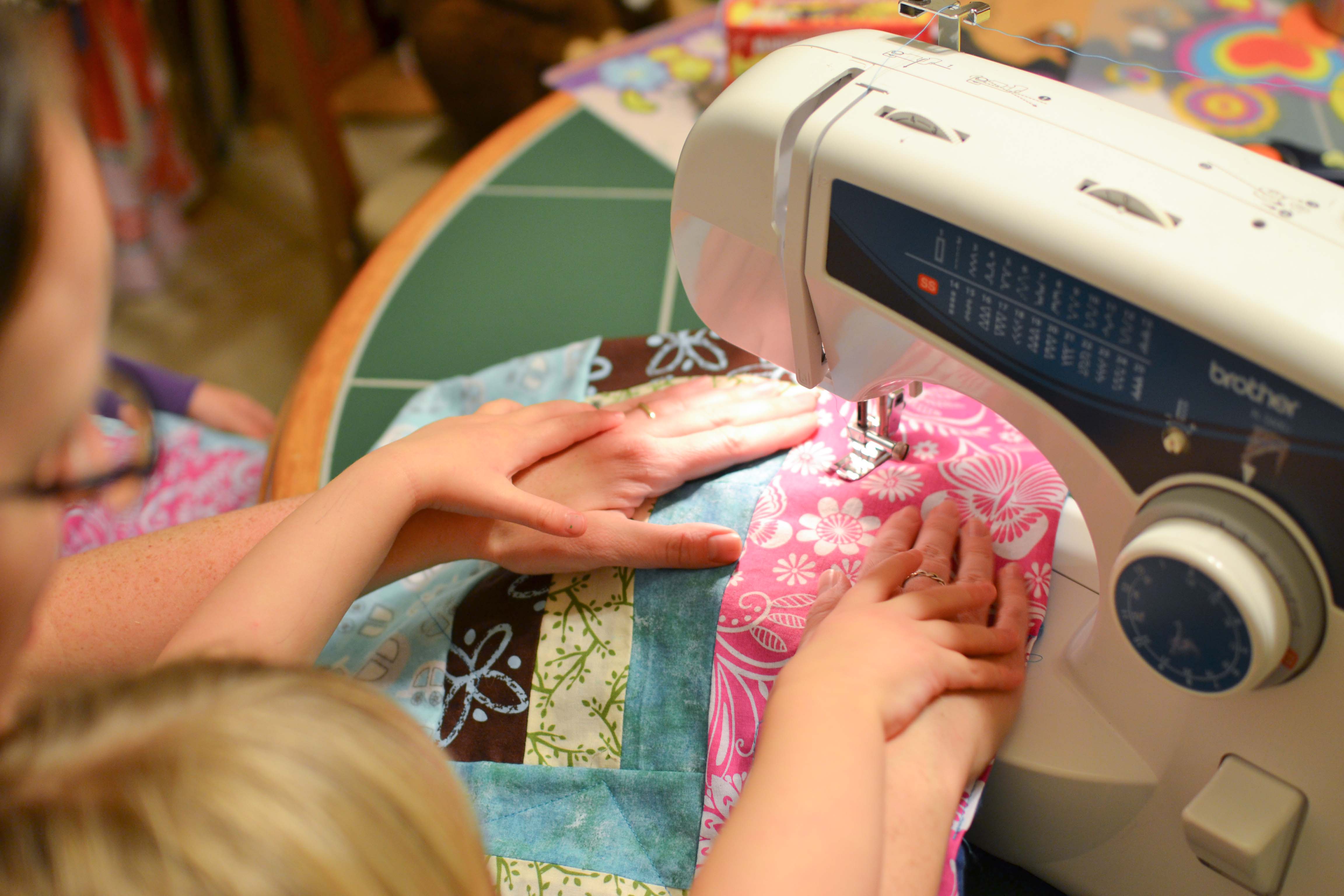 The girls and I bought some remnants a couple weeks ago with the intention of making them into baby blankets. Insert one potty-training Saturday, and in the minutes between the timer beeping (about 12 at a time), we set to our task (also, that’s why no one is wearing clothes. Makes sewing a little more dangerous, but potty training a whole lot easier).