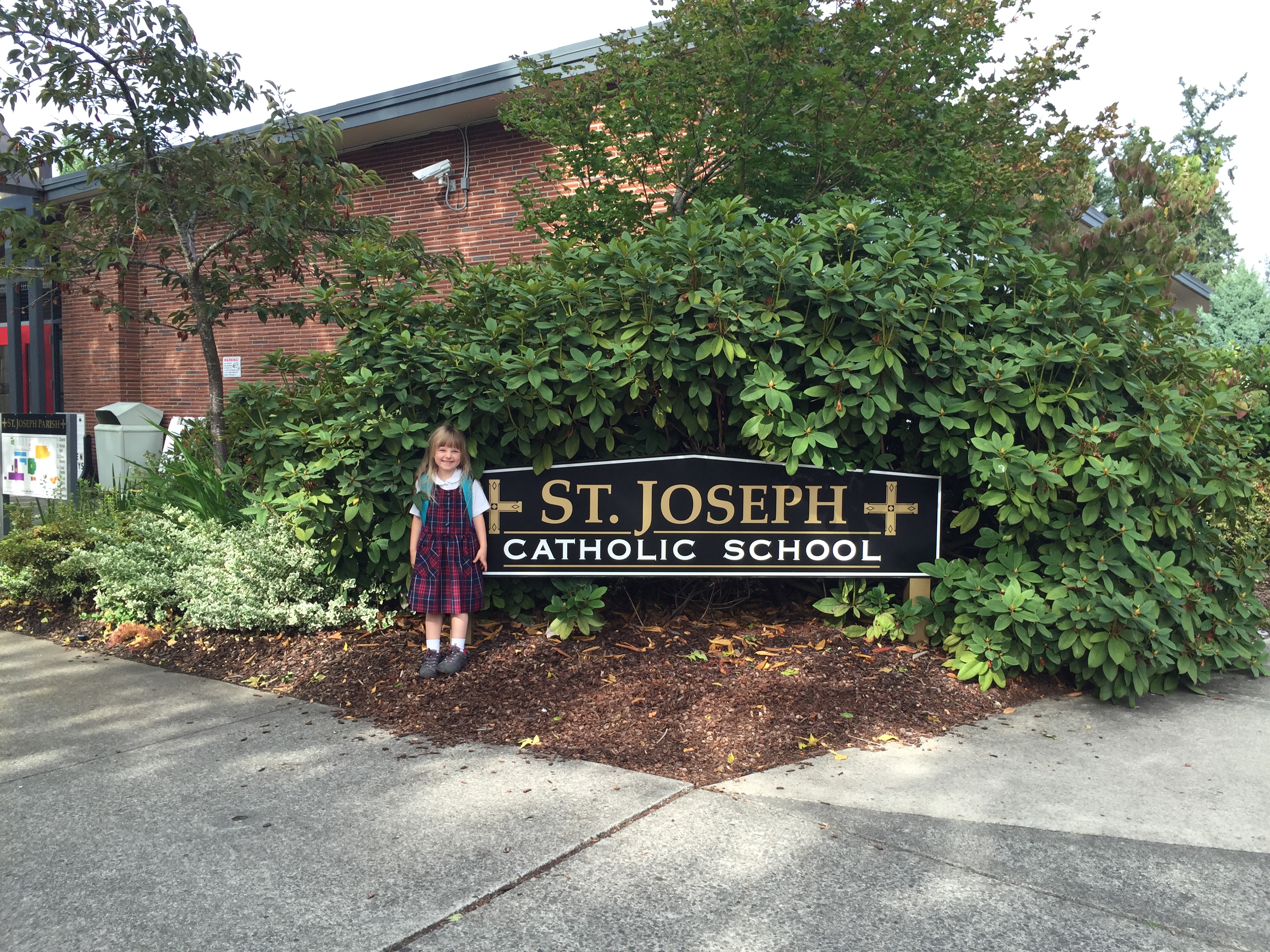 Then, as we left school today, I said, “Love, let’s go take a picture in front of Mary’s grotto. Maybe we can bring flowers tomorrow for your first day at school alone.”