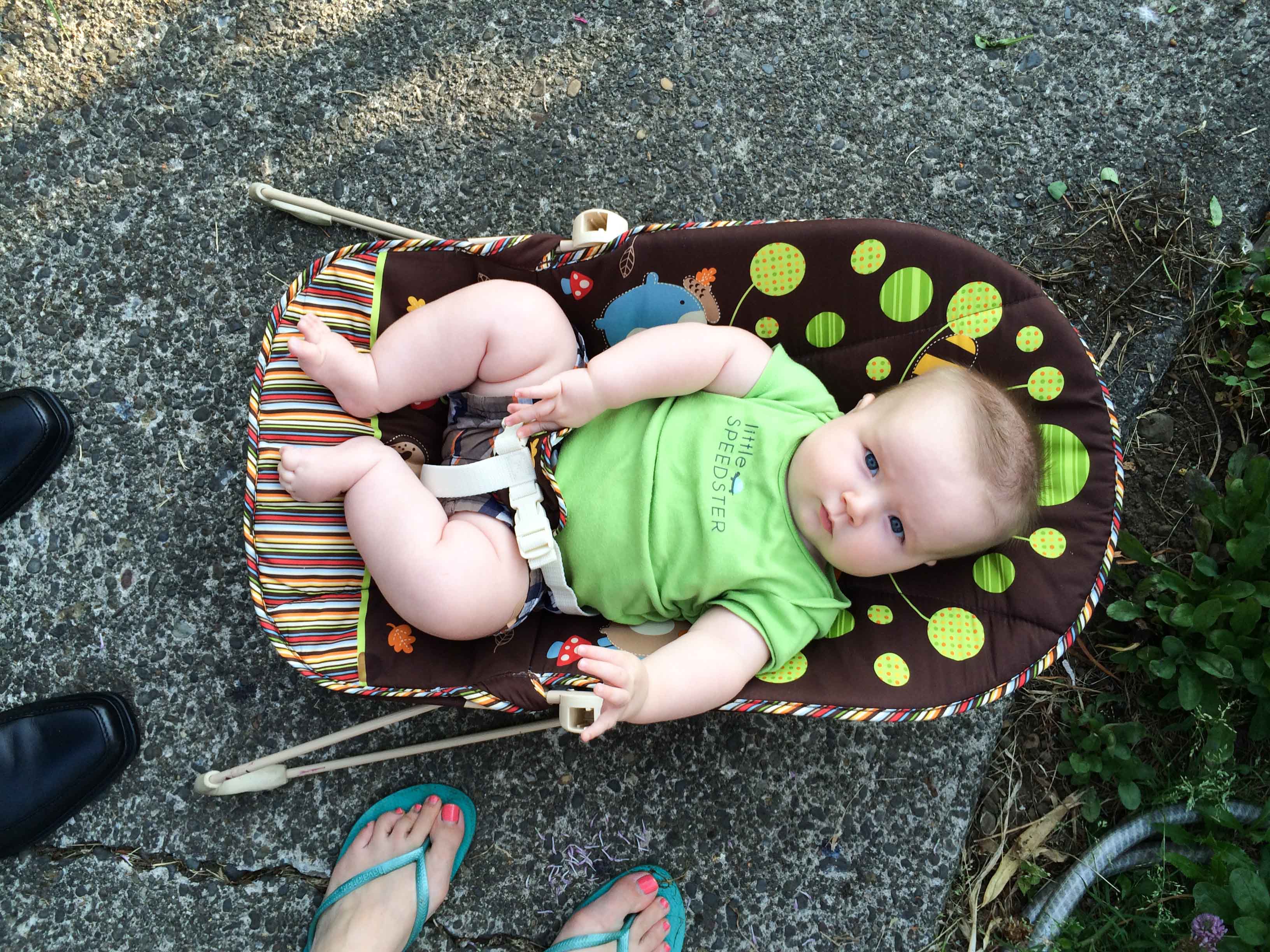 Dom is 4 months old, weighing in at 19lbs 14oz (99%), measuring 2′ 3.7″ (100%), with a head circumference in the 100%. How is 100% even possible? Does that mean he is literally bigger than all the other babies in their metric? Now you can see why we’ve been petitioning friends for any extra 12 month clothes…